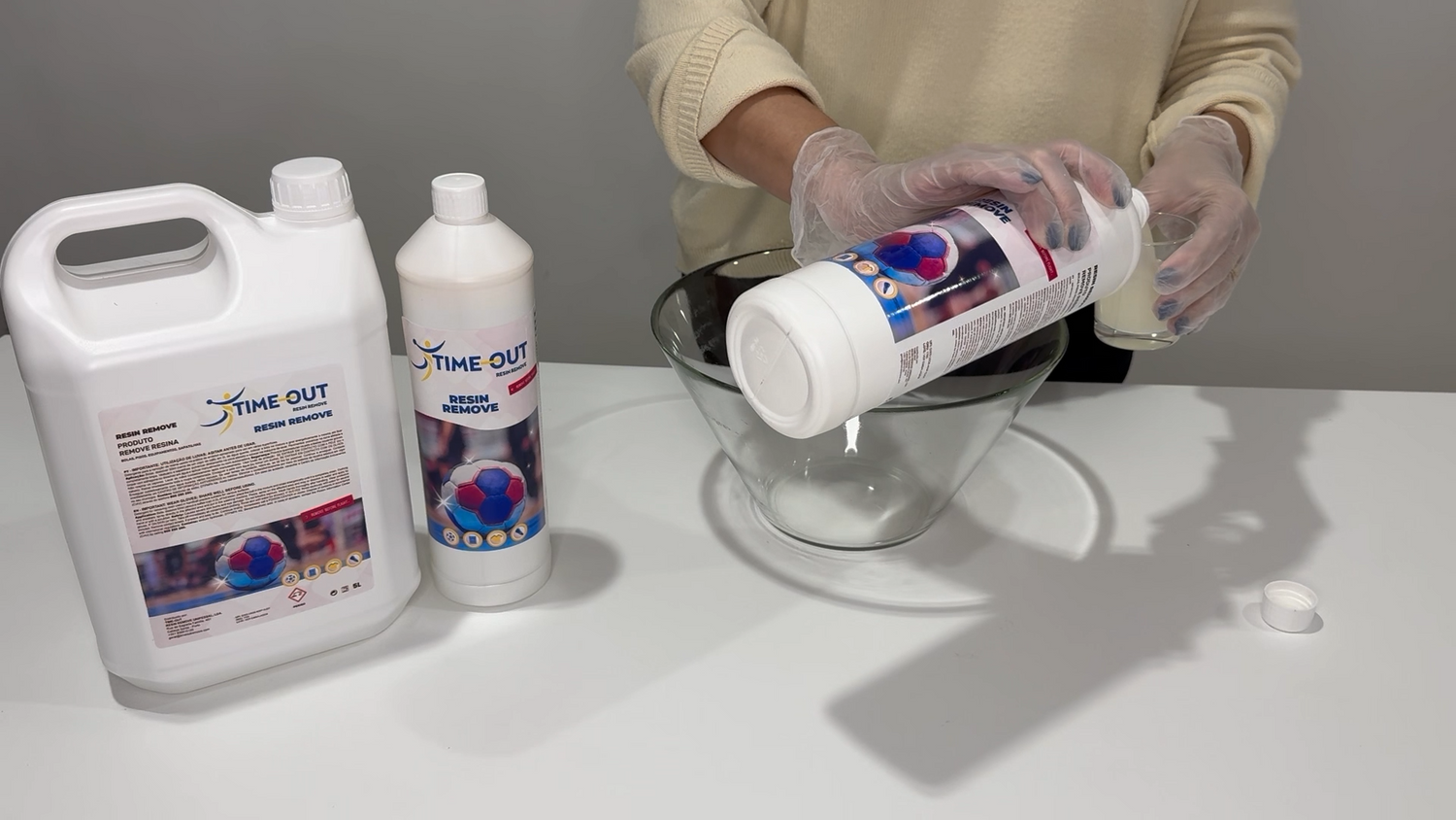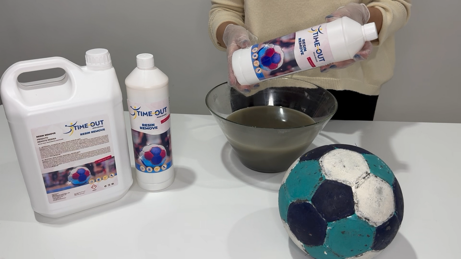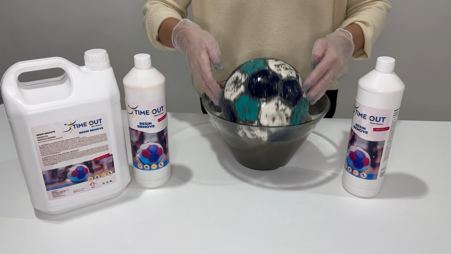 - Para Bolas de Andebol: Dissolva 50ml de RESINE REMOVE (aproximadamente um copo de café) em 2 litros de água quente.